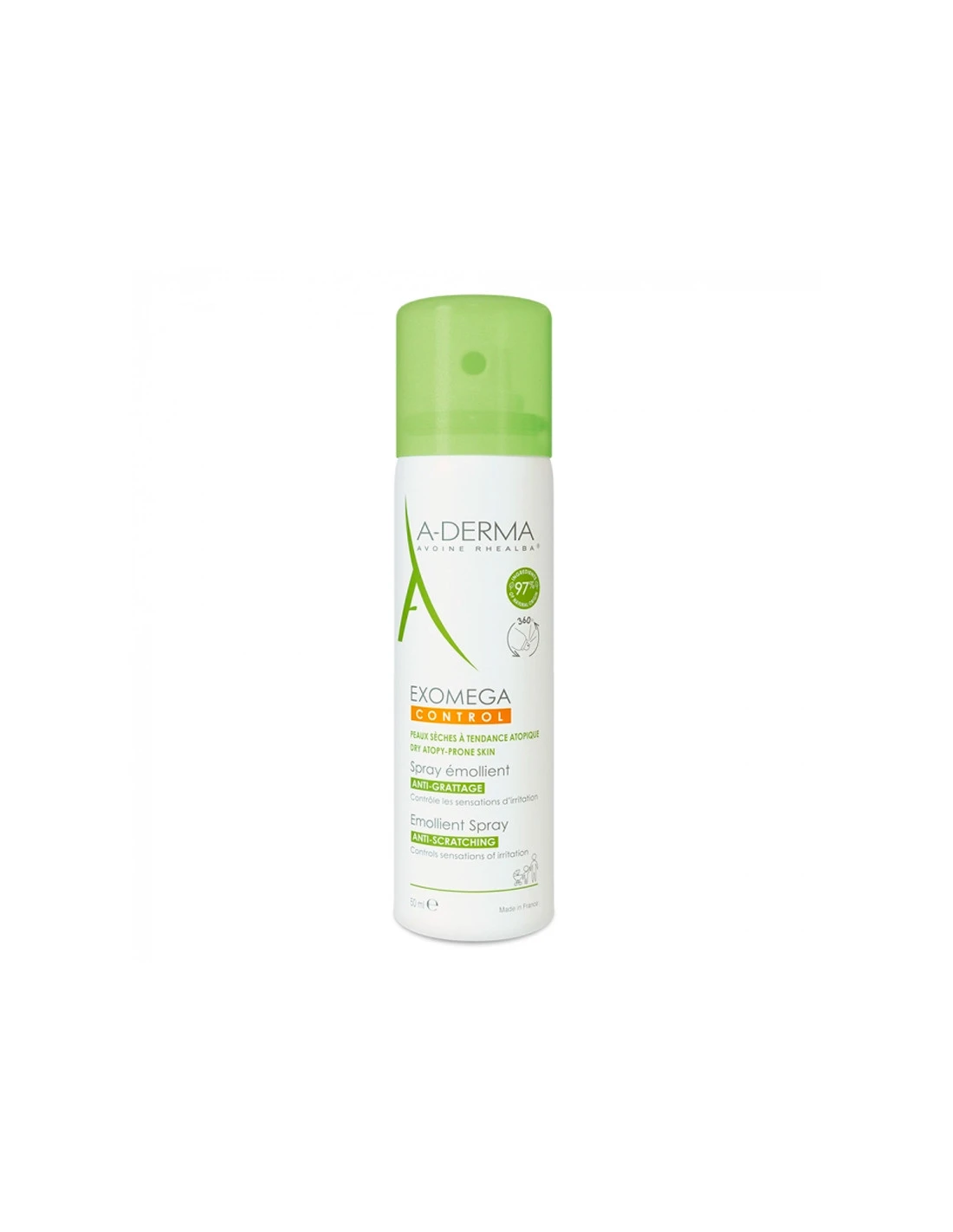 Exomega Control Spray Anti-grattage contient 97% d’ingrédients d’origine naturelle et est formulé à base d’Avoine Rhealba cultivée en agriculture biologique.