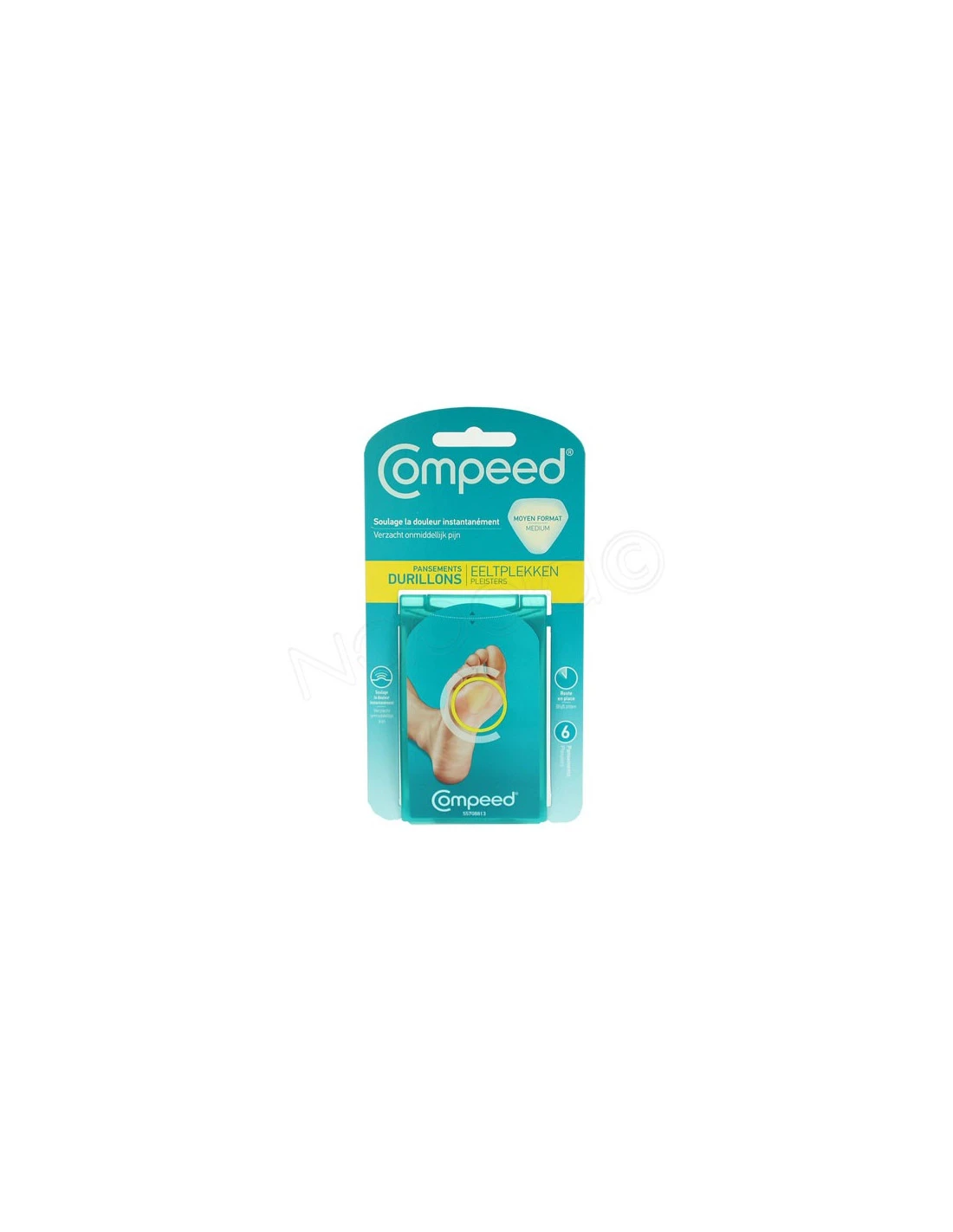 Compeed Durillon est un pansement composé de la technologie hydrocolloïde Compeed, un gel à base de particules améliorant l’hydratation. il protège le durillon des frottement et la pression des chaussures avec un effet coussinet. Il soulage la douleur immédiatement et hydrate et ramolli le durillon afin de favoriser son élimination. Ce pansement reste en place plus de 24heures voir quelques jours, cela varie en fonction des individus.