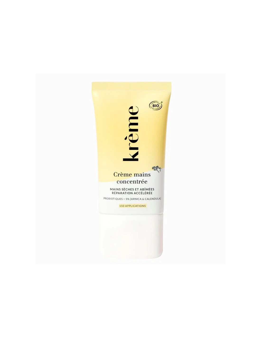 Ce concentré pour mains sèches et abimées est composé de 5% d’extraits réparateurs d’arnica des montagnes et de calendula français, associés à des ferments probiotiques qui réparent intensément les mains les plus abîmées. Cette crème main ne laisse pas de fini gras sur la peau et protège vos mains ( +71% de fonction barrière après application de la crème ). Sa composition haute tolérance sans allergène ni conservateur ni silicone et hautement dosée en actifs réparateurs (arnica, calendula, probiotiques) en fait l’alliée parfaite des mains particulièrement abîmées, qui ne supportent plus grand chose.