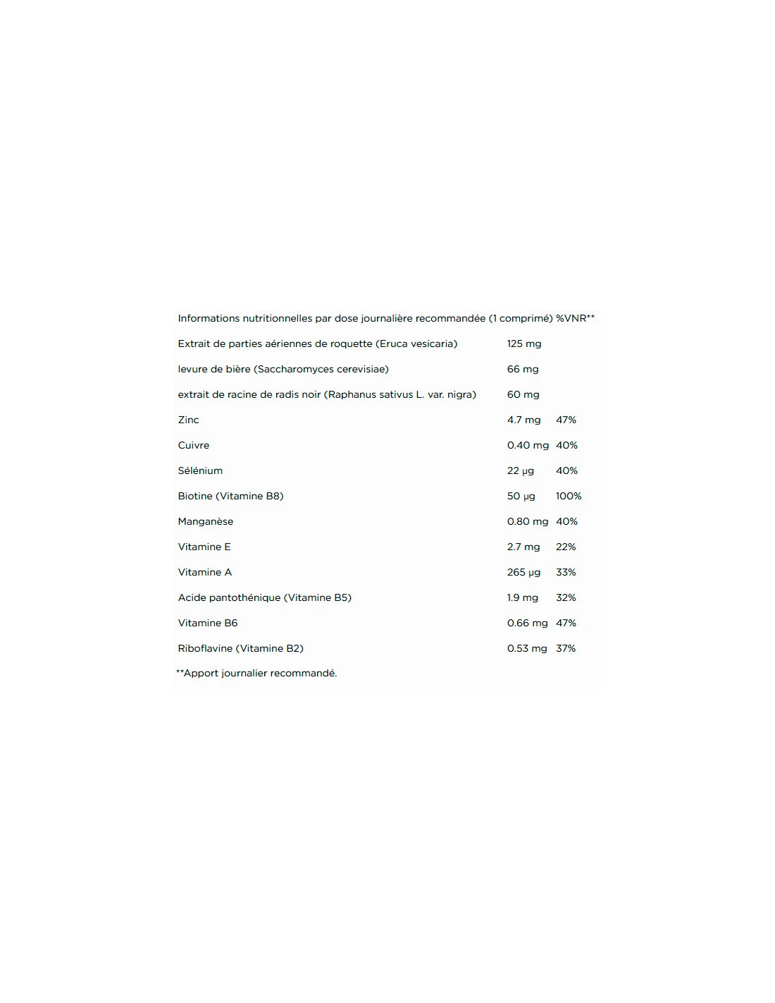agent de charge : cellulose microcristalline ; extrait de parties aériennes de roquette (eruca vesicaria) ; correcteur d’acidité ; phosphate tricalçique ; levure de bière (saccharomyces cerevisiae) ; extrait de racines de radis noir (raphanus sativus l.var nigra) (antiagglomérant : dioxyde de silicium nano]) ; pelliculage (agents d’enrobage : hydroxypropylmethylcellulose, polydextrose, carbonate de calcium, talc) ; extrait de spiruline (arthrospira platensis) ; colorants : caramel sulfite d’ammonium, riboflavine ; maltodextrine ; triglycérides à chaînes moyennes) ; sulfate de zinc ; levure enrichie en sélénium ; émulsifiant : sels de magnésium d’acides gras ; acétate de dl-alpha-tocophéryle (vitamine e) ; d-biotine (vitamine b8) ; citrate de manganèse ; acétate de rétinyle (vitamine a) ; gluconate de cuivre ; d-pantothénate de calcium (vitamine b5) ; chlorhydrate de pyridoxine (vitamine b6) ; riboflavine (vitamine b2).