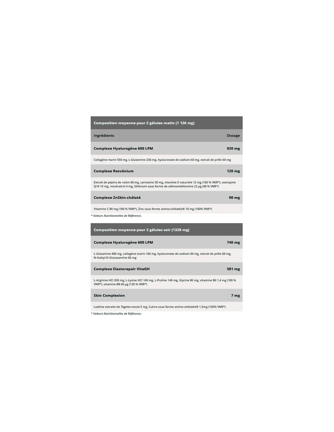 Ingrédients gélule matin : peptides de collagène de poisson, L-Glutamine, vitamine C, hyaluronate de sodium, extrait de tige de prêle (Equisetum arvense), extrait de pépins de raisin (Vitis vinifera), agent de charge : cellulose microcristalline, anti-agglomérants : stéarate de magnésium végétal et phosphate de calcium, vitamine E naturelle (acétate de d-α-tocophérols), Zinc sous forme de bisglycinate, carnosine, coenzyme Q10, Sélénium sous forme de sélénométhionine, trans-resvératrol. Enveloppe de la gélule : hydroxypropylméthylcellulose, colorant : complexes cuivriques de chlorophyllines.