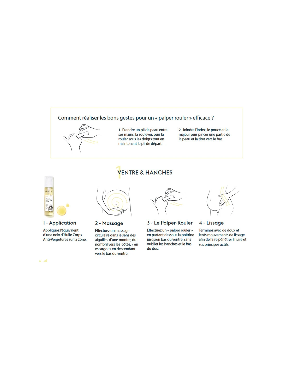 Appliquer l’huile par massages circulaires matin et soir sur la poitrine, le ventre, les hanches et les cuisses.
