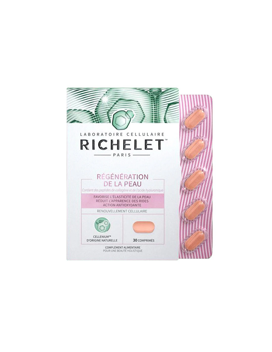 Le complément beauté RICHELET Régénération de la Peau est enrichi en CELLENIUM d’origine naturelle, en collagène et en acide hyaluronique. Il soutient l’élasticité de la peau(1) et réduit l’apparence des rides(2).
